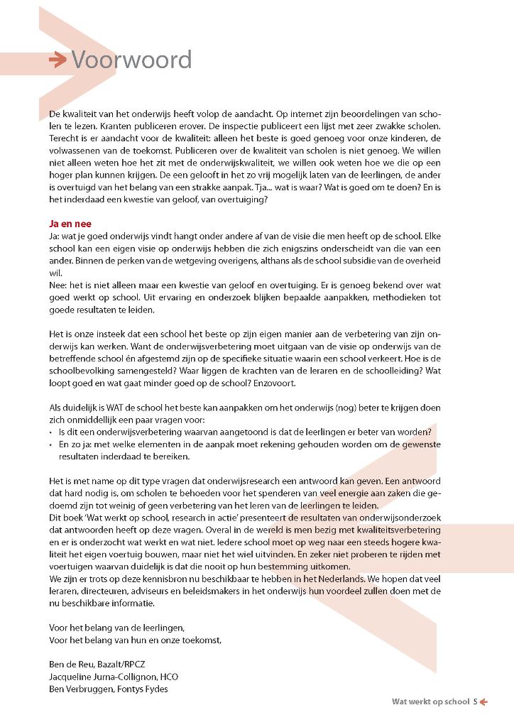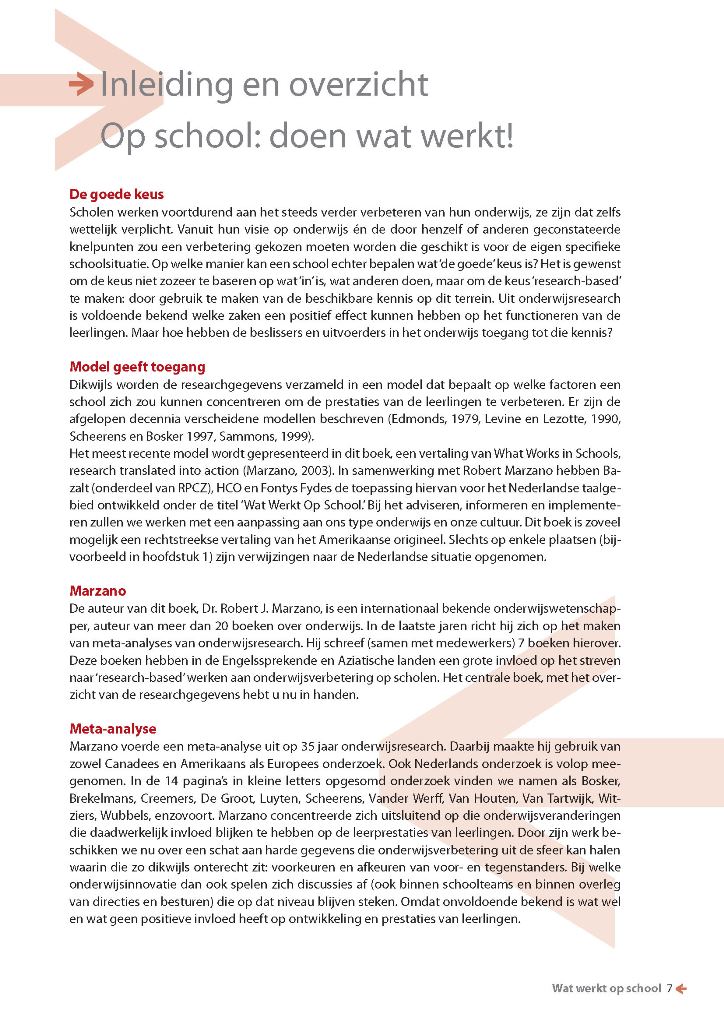 Research in actie Meta-analyses van 35 jaar onderwijsresearch direct toepasbaar in beleid en praktijk Veel van de verschillen in de ontwikkeling en leerprestaties van kinderen hebben te maken met de leerlingen zelf: hun leven thuis, hun al opgedane kennis, hun motivatie. Het goede nieuws is dat er heel wat is dat scholen en leraren kunnen doen om de ontwikkeling en de prestaties van hun leerlingen te verbeteren; als ze de richting volgen die in dit boek wordt aangegeven.