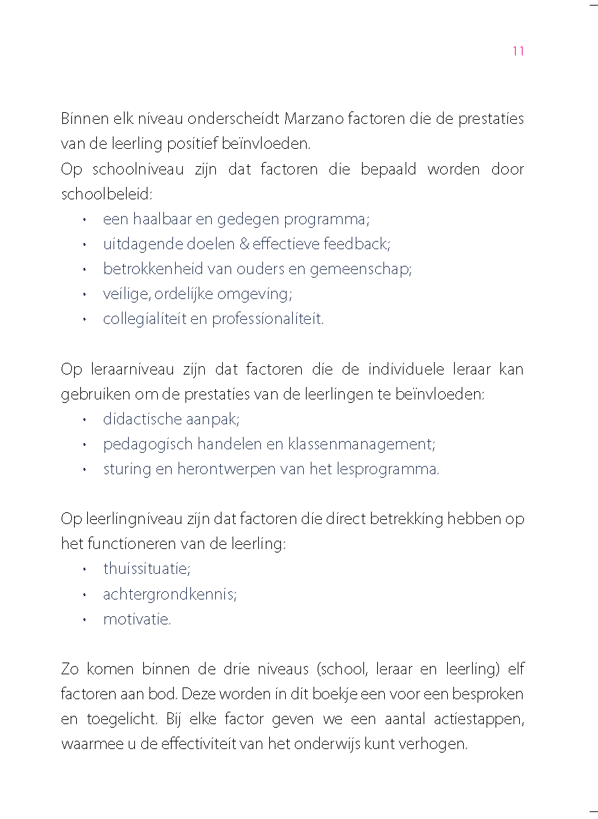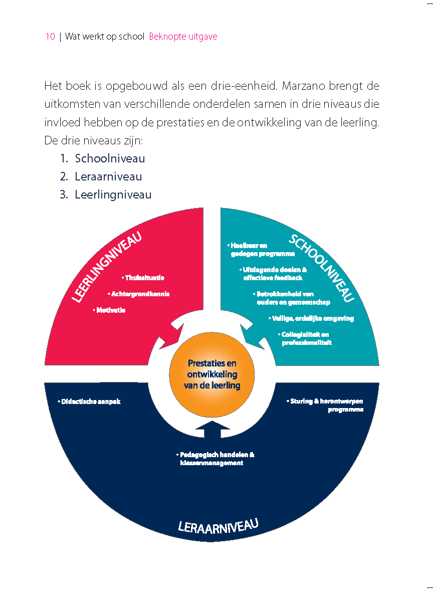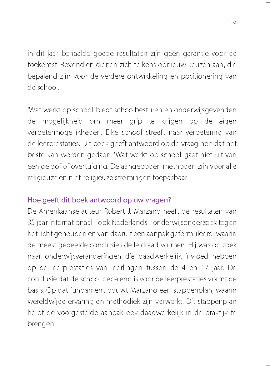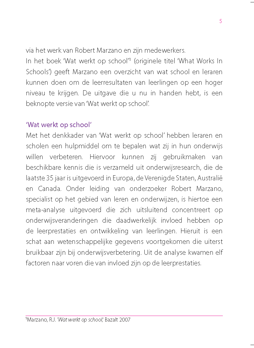 In het boek ‘Wat werkt op school’ (What Works In Schools) geeft Marzano een overzicht van wat een school en een leraar kunnen doen om de leerresultaten van leerlingen op een hoger niveau te krijgen.