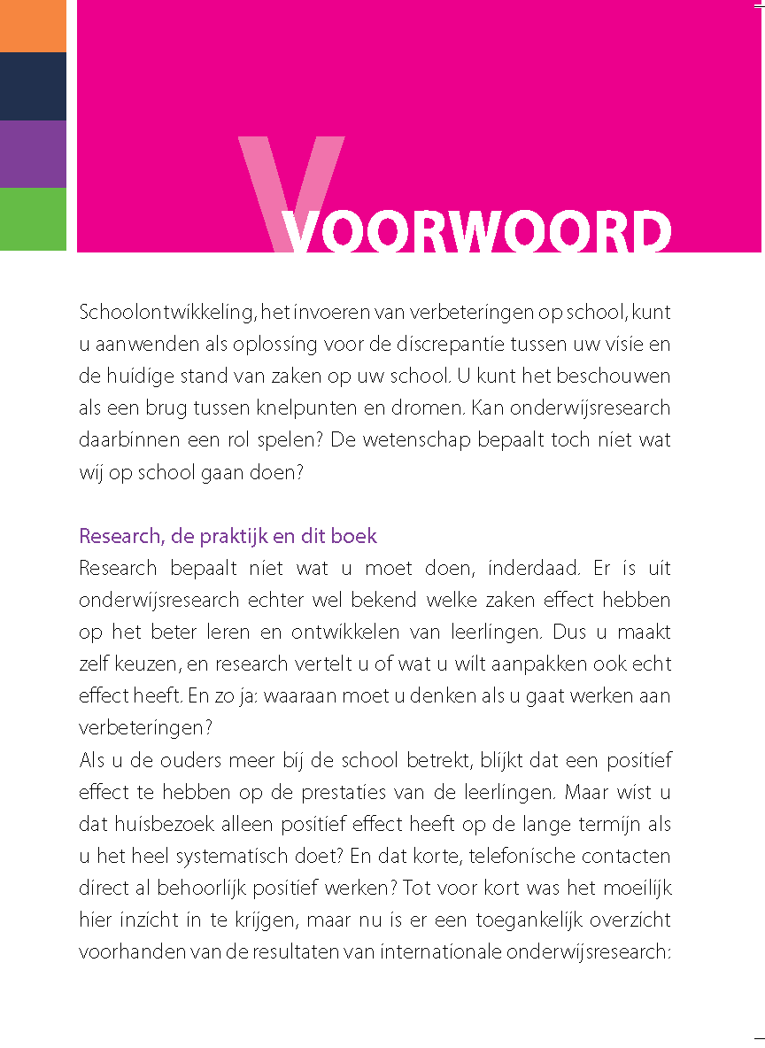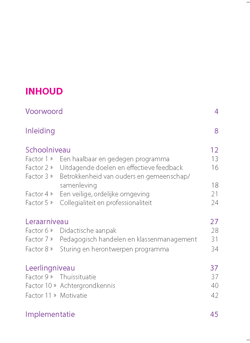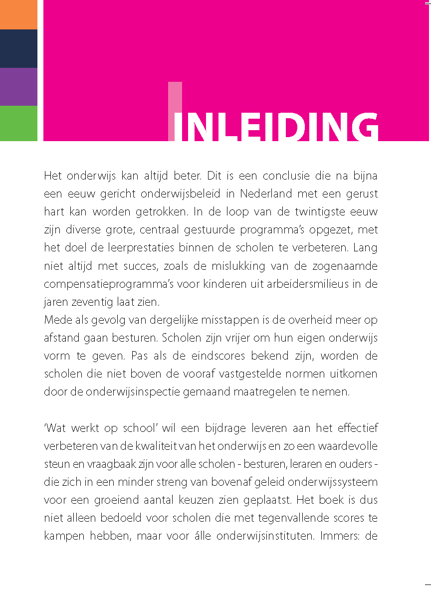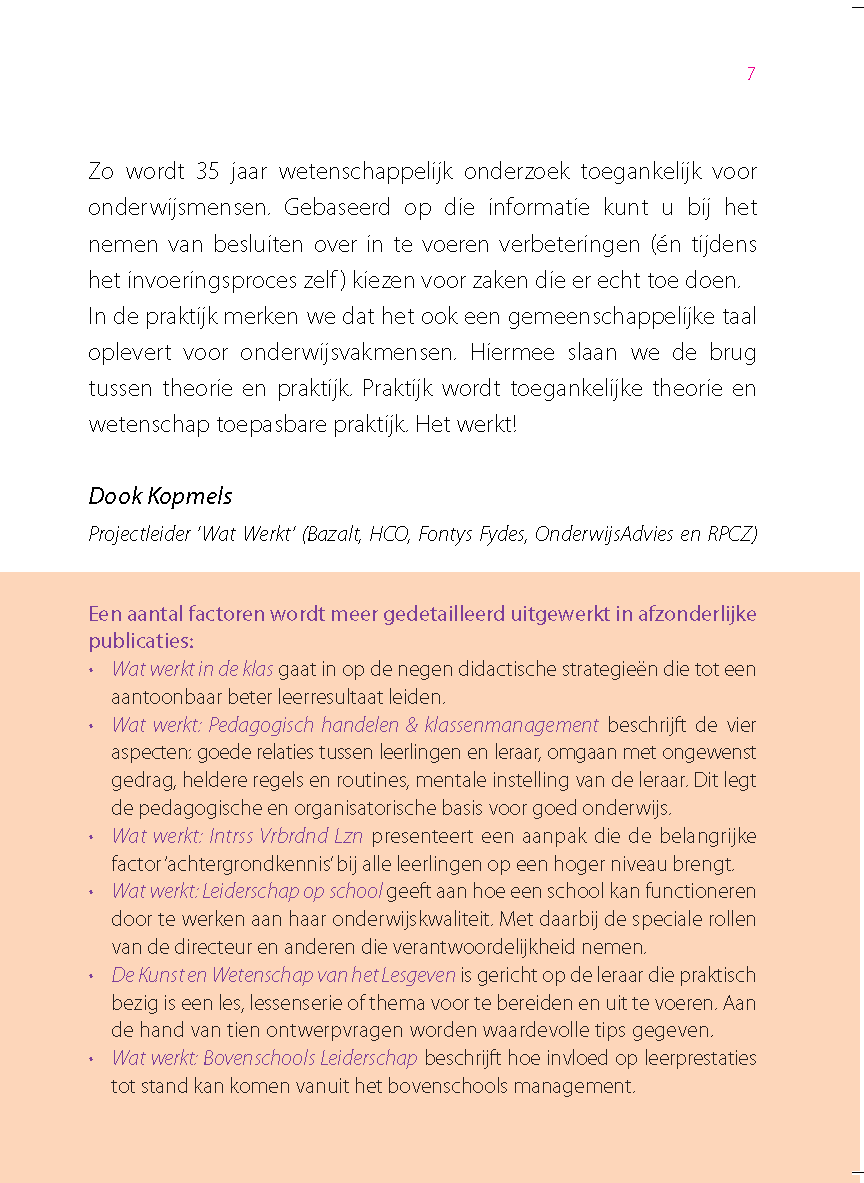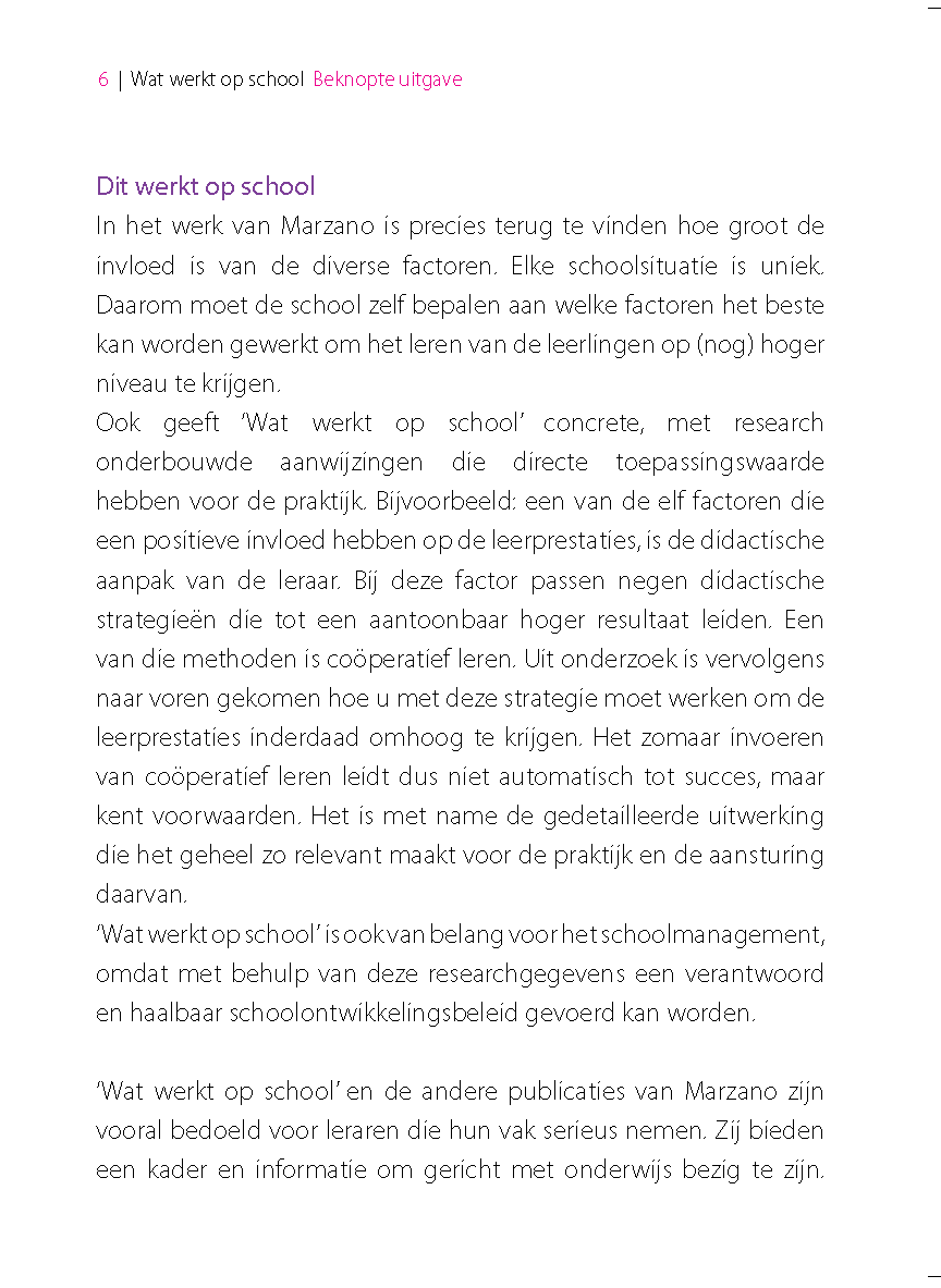 Dit boek is een beknopte versie, een samenvatting van ‘Wat werkt op school’. Op verzoek uitgebracht zonder de weergave van de researchgegevens en de uitwerking van de actiestappen die in het originele boek staan.