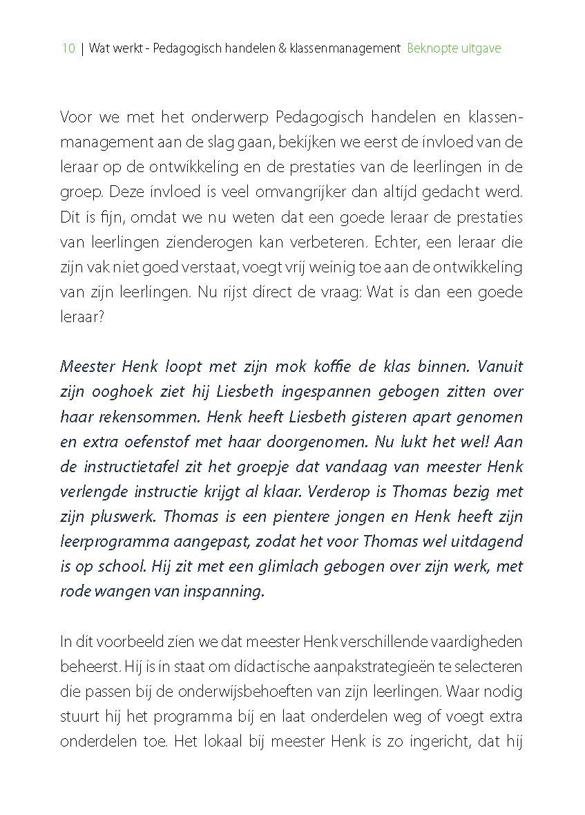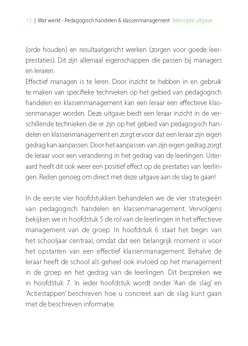 Dit boekje is een beknopte uitgave van ‘Wat werkt: Pedagogisch handelen & klassenmanagement en geeft een samenvatting van de essentiële informatie uit dit boek. Het beschrijft 4 fundamentele strategieën voor pedagogisch handelen en klassenmanagement waarmee je het effectief managen van een klas in de vingers kunt krijgen. Met deze beknopte uitgave maak je hier op een efficiënte manier kennis mee.