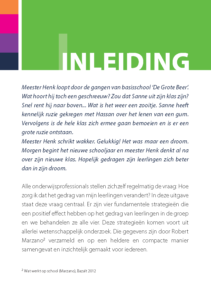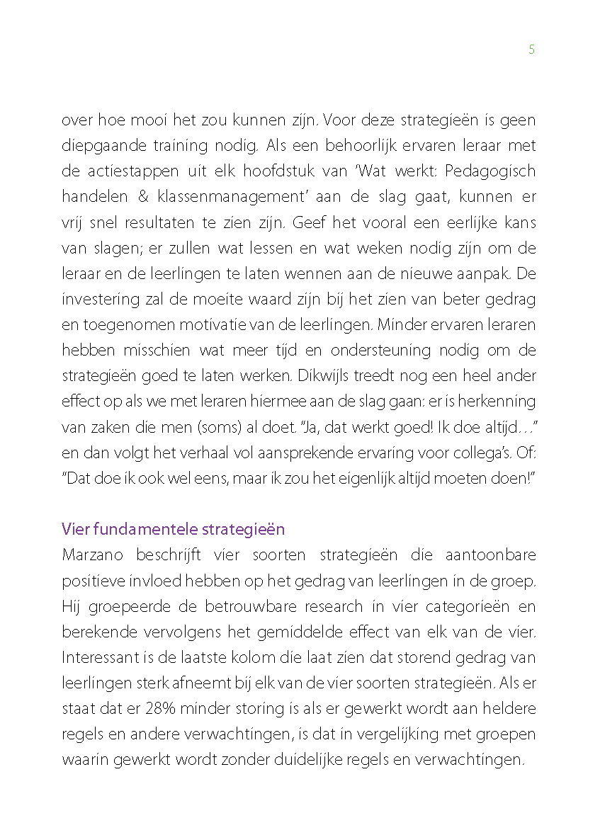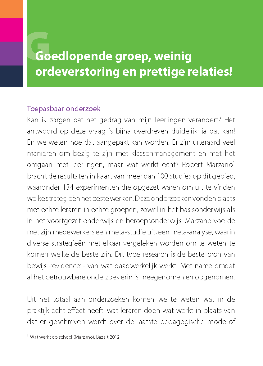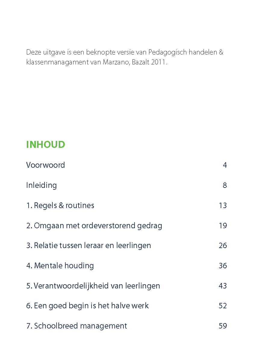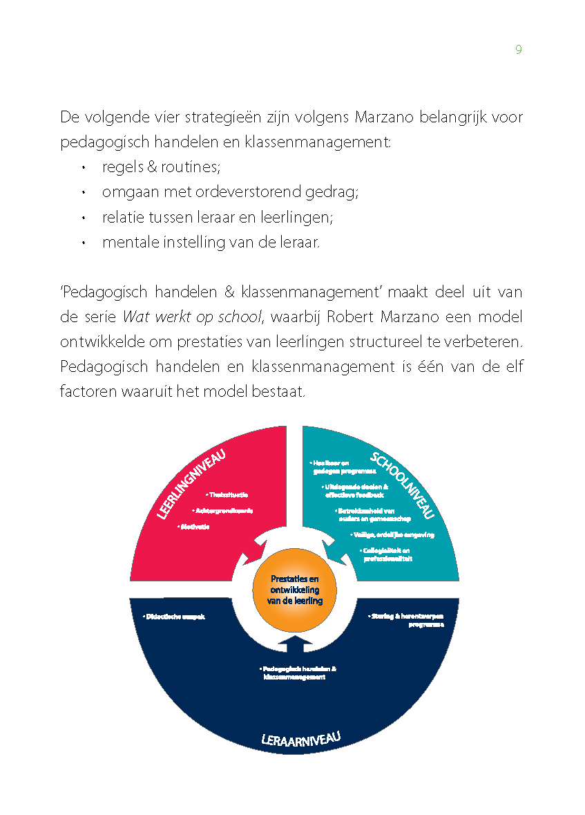In het boek ‘Wat werkt op school’ beschrijft Robert Marzano 11 factoren die de leerresultaten van leerlingen op school structureel verbeteren. Pedagogisch handelen & klassenmanagement is één van deze elf factoren en wordt beschreven in de uitgave Wat werkt: Pedagogisch handelen & klassenmanagement.