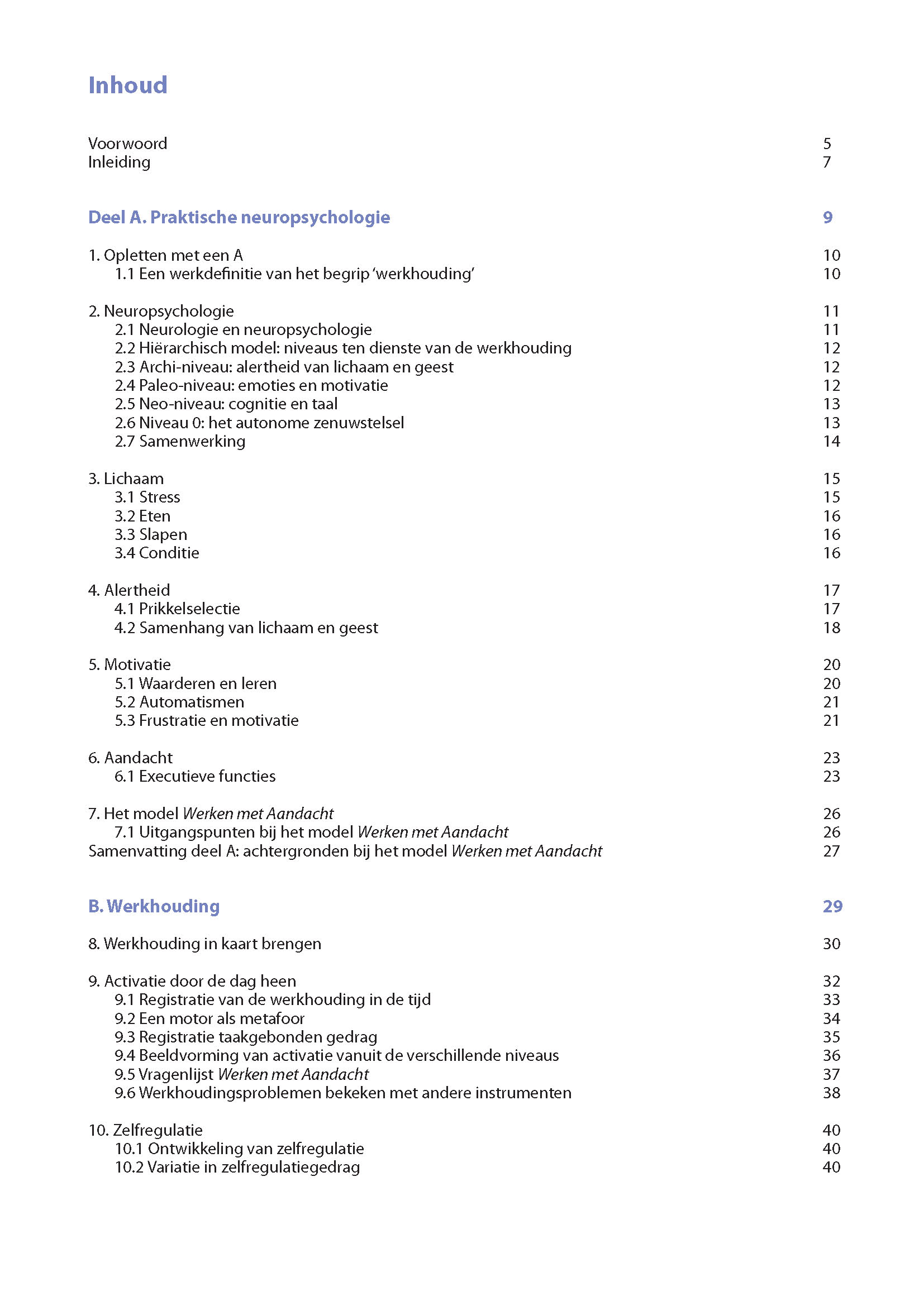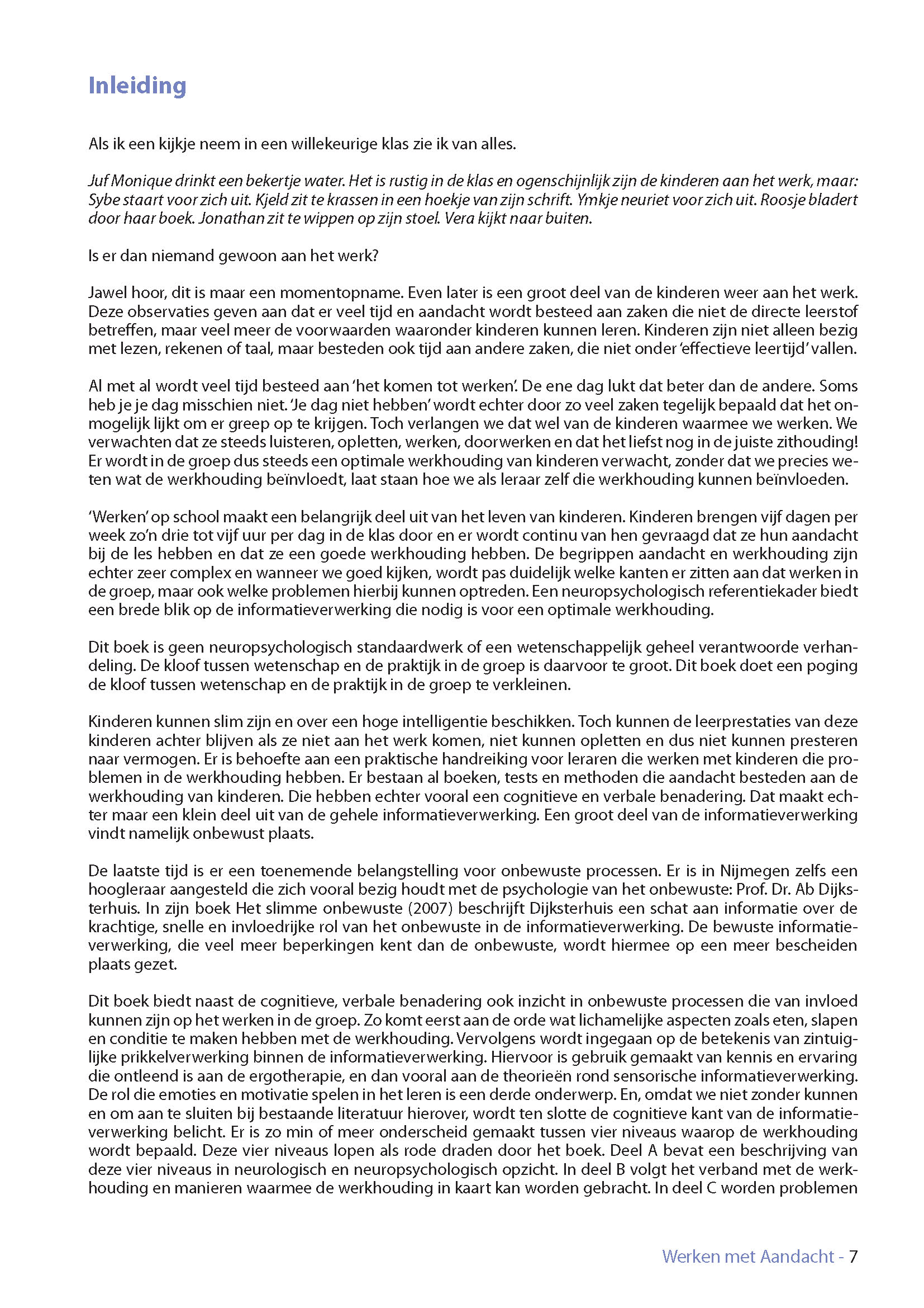 Dit boek laat zien dat een goede werkhouding méér is dan alleen een goede concentratie. Ook lichamelijke factoren, alertheid en motivatie hebben invloed op de werkhouding. Het model Werken met Aandacht besteedt aandacht aan al deze aspecten. Hiervoor zijn inzichten uit de (neuro)psychologie, de ergotherapie en de theorie rond sensorische informatieverwerking gebruikt. Praktisch gezien wordt er aandacht besteed aan hoe problemen met de werkhouding in de groep opgespoord kunnen worden. Belangrijker is dat er iets aan deze problemen gedaan wordt. In het laatste deel van het boek staat een aanpak beschreven die in de groep direct gebruikt kan worden.