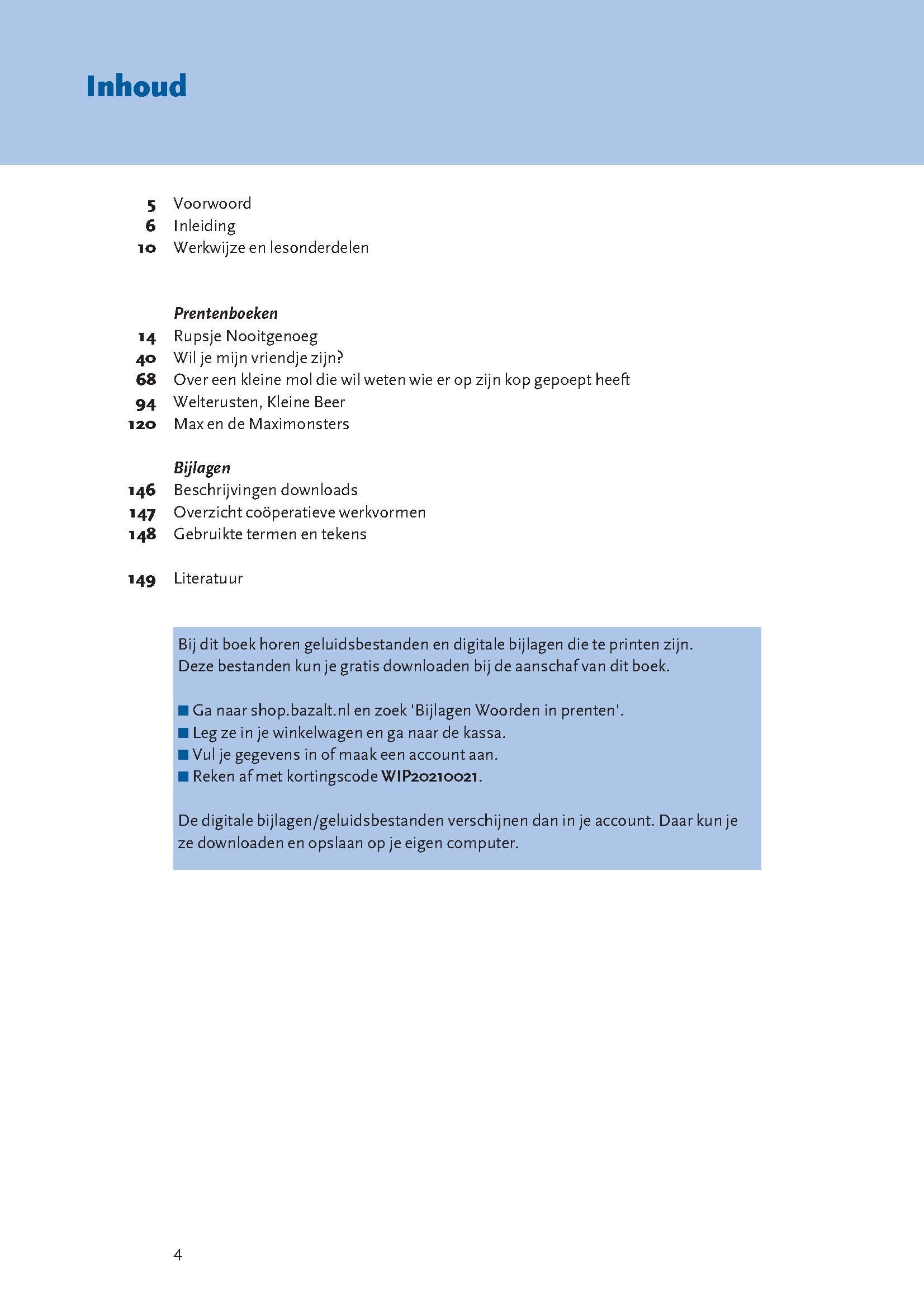 Woorden in prenten bestaat uit een boek met 25 concrete lessen en een digitale bijlage. Deze bijlage bevat geluidsfragmenten en werkmateriaal zoals woordenlijsten, woordkaartjes en evaluatieformulieren. De digitale bijlagen worden automatisch toegevoegd in je klantaccount na betaling van het boek in onze webshop. Je vindt deze direct terug in je klantaccount onder 'Mijn directe downloads'.