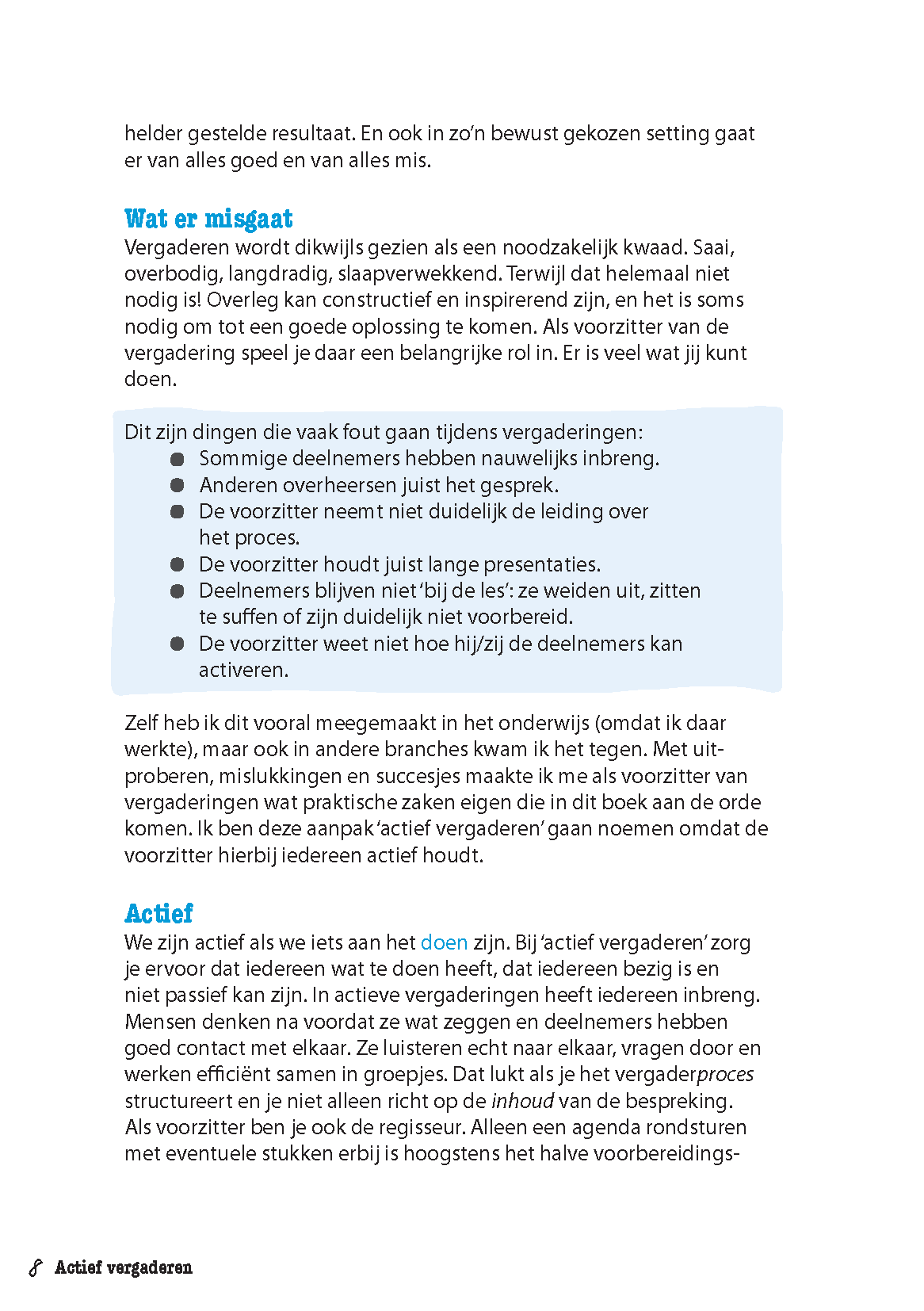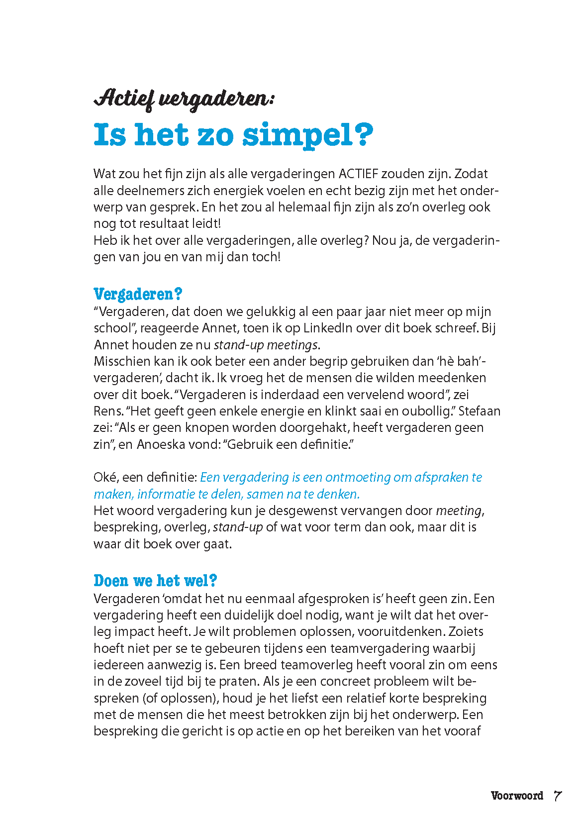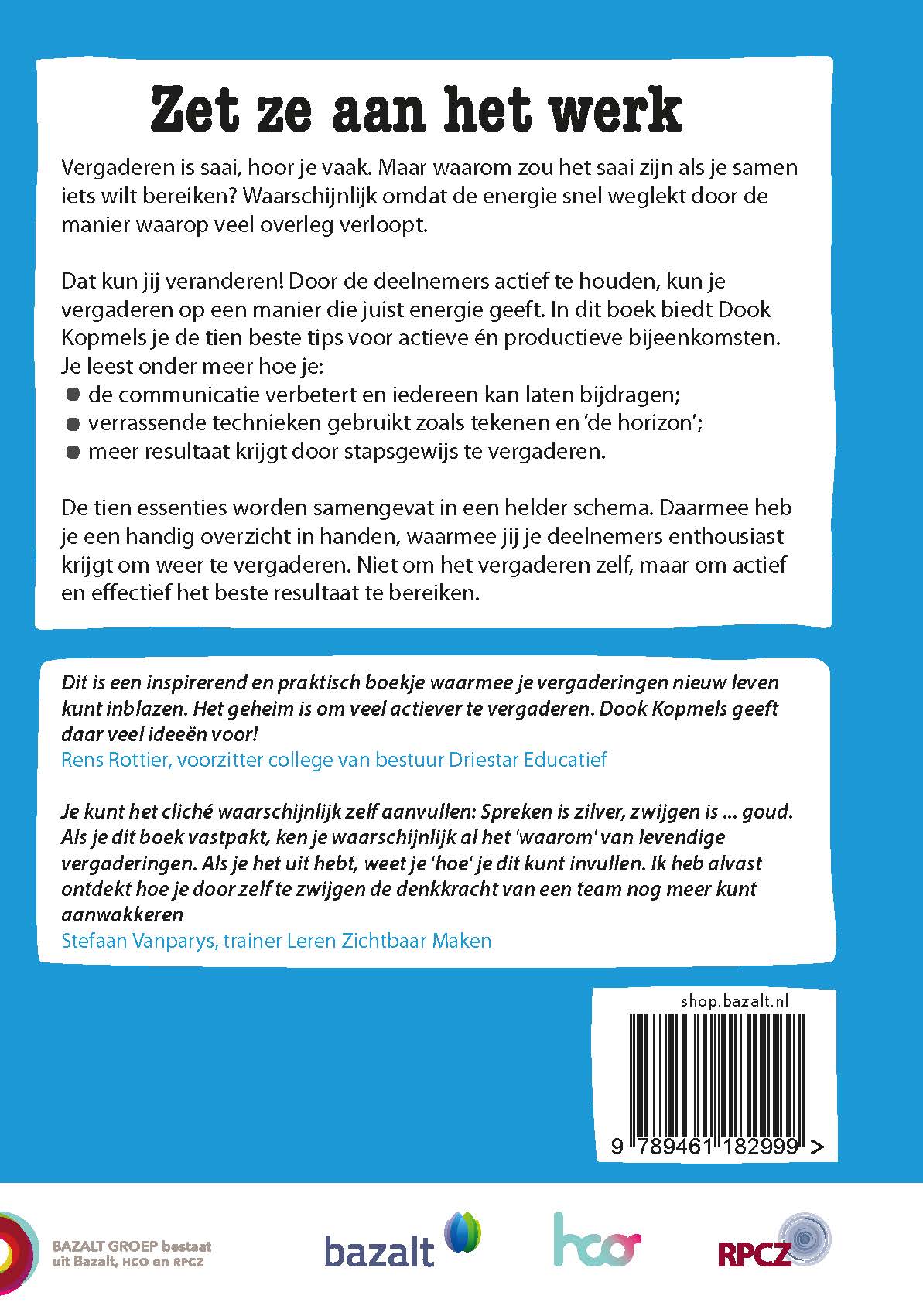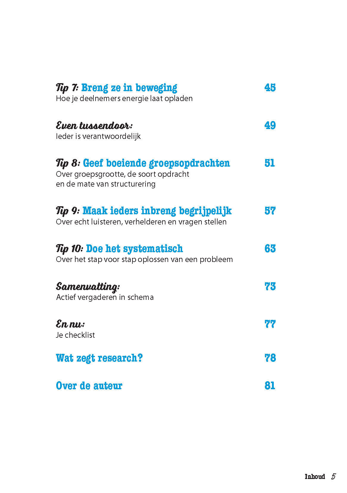 Dat kun jij veranderen! Door de deelnemers actief te houden, kun je vergaderen op een manier die juist energie geeft. In dit boek biedt Dook Kopmels je de tien beste tips voor actieve én productieve bijeenkomsten. Je leest onder meer hoe je: