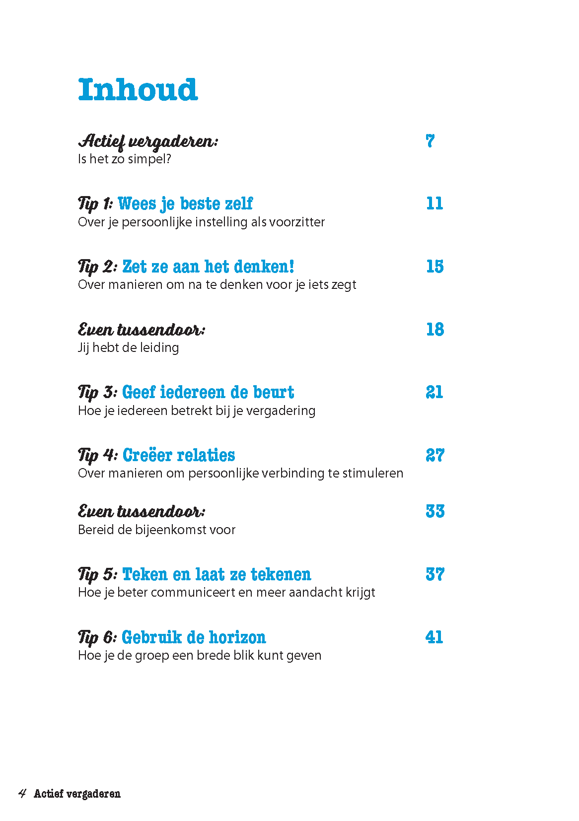 De tien essenties worden samengevat in een helder schema. Daarmee heb je een handig overzicht in handen, waarmee jij je deelnemers enthousiast krijgt om weer te vergaderen. Niet om het vergaderen zelf, maar om actief en effectief het beste resultaat te bereiken.Dit is een inspirerend en praktisch boekje waarmee je vergaderingen nieuw leven kunt inblazen. Het geheim is om veel actiever te vergaderen. Dook Kopmels geeft daar veel ideeën voor!