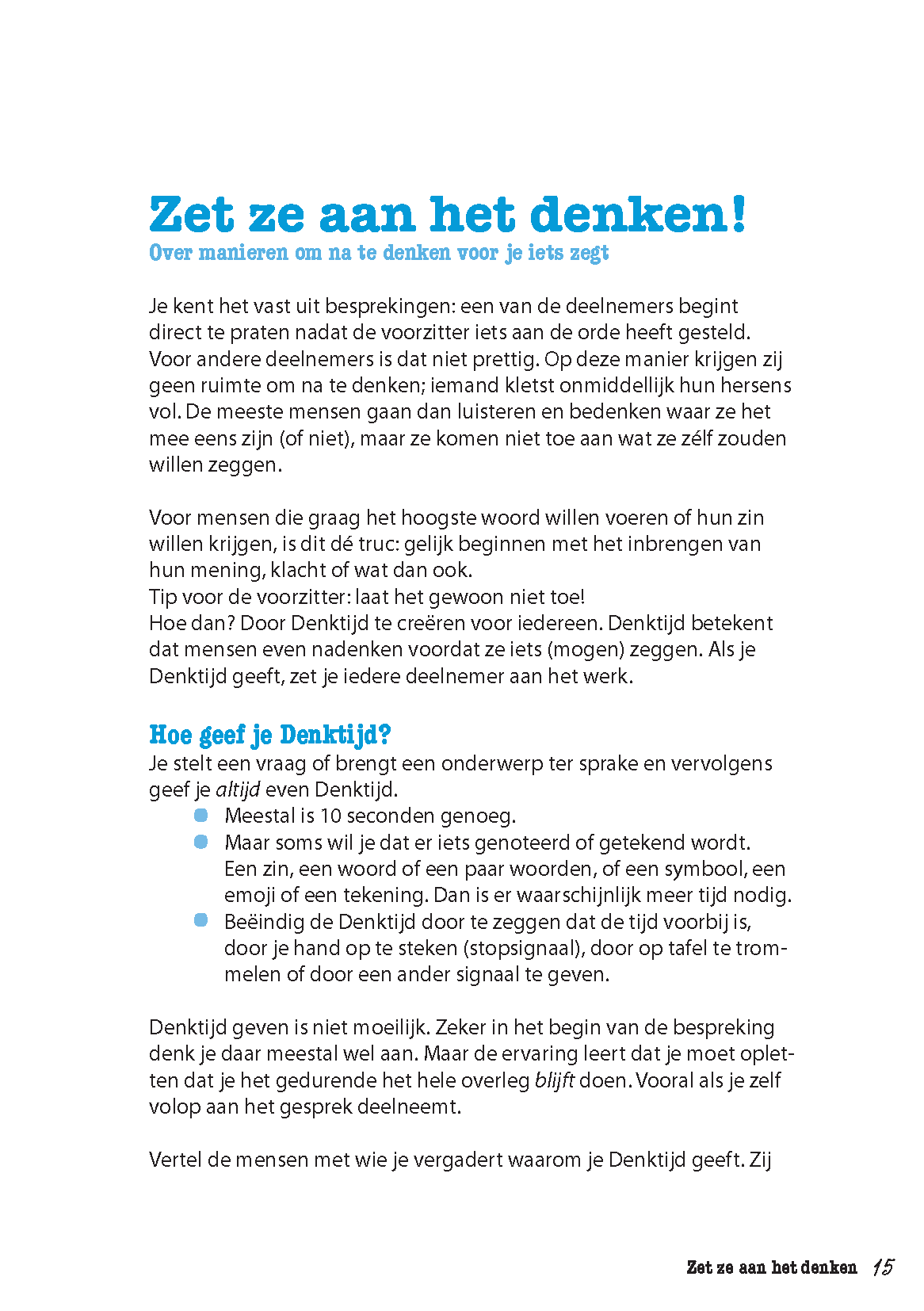 Je kunt het cliché waarschijnlijk zelf aanvullen: Spreken is zilver, zwijgen is ... goud. Als je dit boek vastpakt, ken je waarschijnlijk al het 'waarom' van levendige vergaderingen. Als je het uit hebt, weet je 'hoe' je dit kunt invullen. Ik heb alvast ontdekt hoe je door zelf te zwijgen de denkkracht van een team nog meer kunt aanwakkeren.
