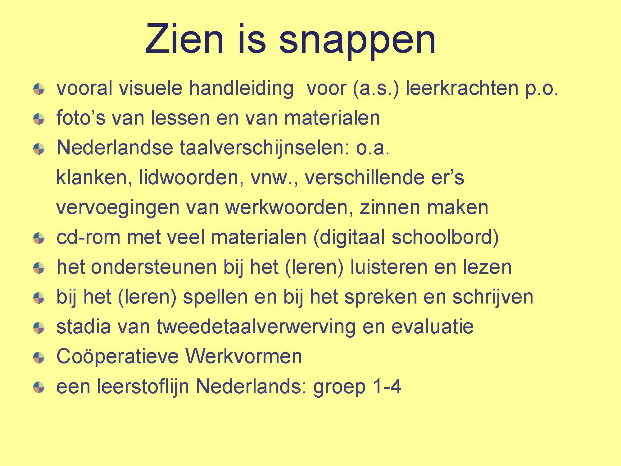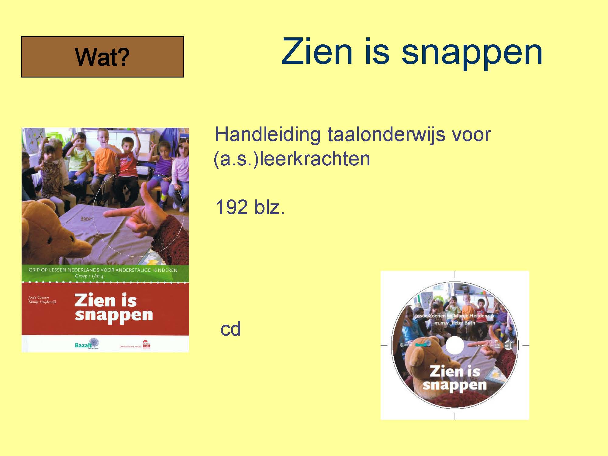 Zien is snappen is een vooral visuele handleiding voor taalonderwijs in het primair onderwijs met een of meer anderstalige kinderen in de klas.